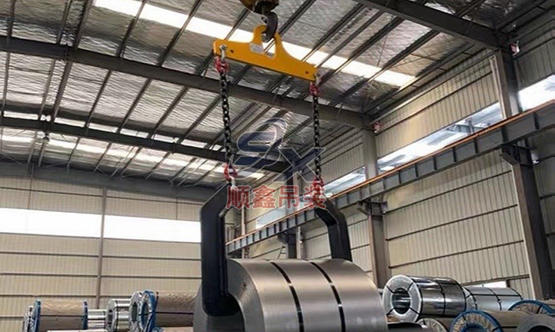 翻轉(zhuǎn)吊具通過(guò)機(jī)械剪力原理,對(duì)立式擺放的卷鋼進(jìn)行單邊抓取,來(lái)完成卷鋼的裝卸,當(dāng)改變重力點(diǎn)時(shí),可以對(duì)卷鋼進(jìn)行翻轉(zhuǎn),作業(yè)時(shí)不傷鋼卷。其吊耳采用加厚處理,焊縫飽滿牢固、延長(zhǎng)使用壽命。